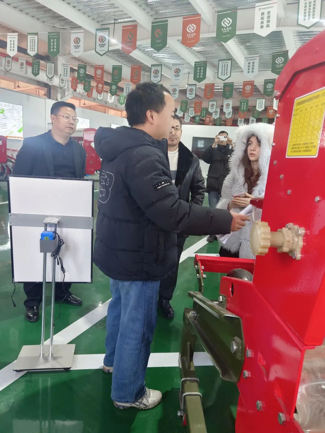 在产品展厅,亚澳农机负责外贸的时驰经理详细介绍了公司的核心技术与产品优势。针对代表团关注的气吸式播种机,重点演示了其核心优势:搭载进口指夹式排种器,播种精度高达95%以上,远超国家标准;创新采用梯堵装置等专利技术,可实现旋耕、整地、播种、施肥一体化作业,适配干旱与黏湿等多种土壤环境,且能根据需求定制双苗带机型,完全契合乌兹别克斯坦的棉花种植需求。“我们的产品在国内小麦、玉米主产区可实现亩均增产10%-15%,作业成本降低30%以上,相信在乌兹别克斯坦也能发挥同样的效益。”时驰经理的介绍让代表团成员频频点头。